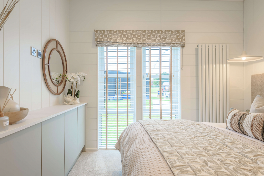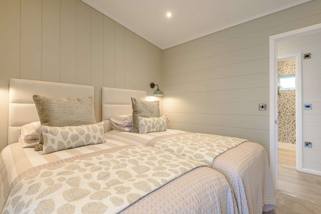 With its butterfly roof and striking design, the Aura stands out. The high level windows and doors make the outdoors part of every living space and bring in tonnes of natural light. Inside you’ll find curved wave-headed curtains, coordinated soft furnishings, mood lighting, and laminate flooring that feels fresh yet durable.