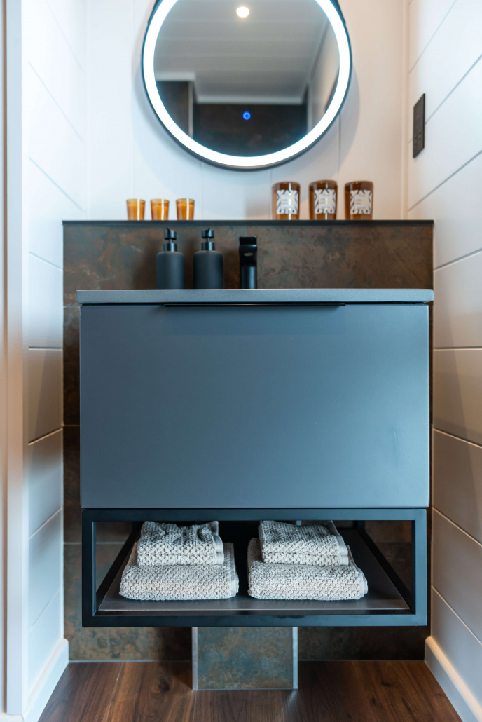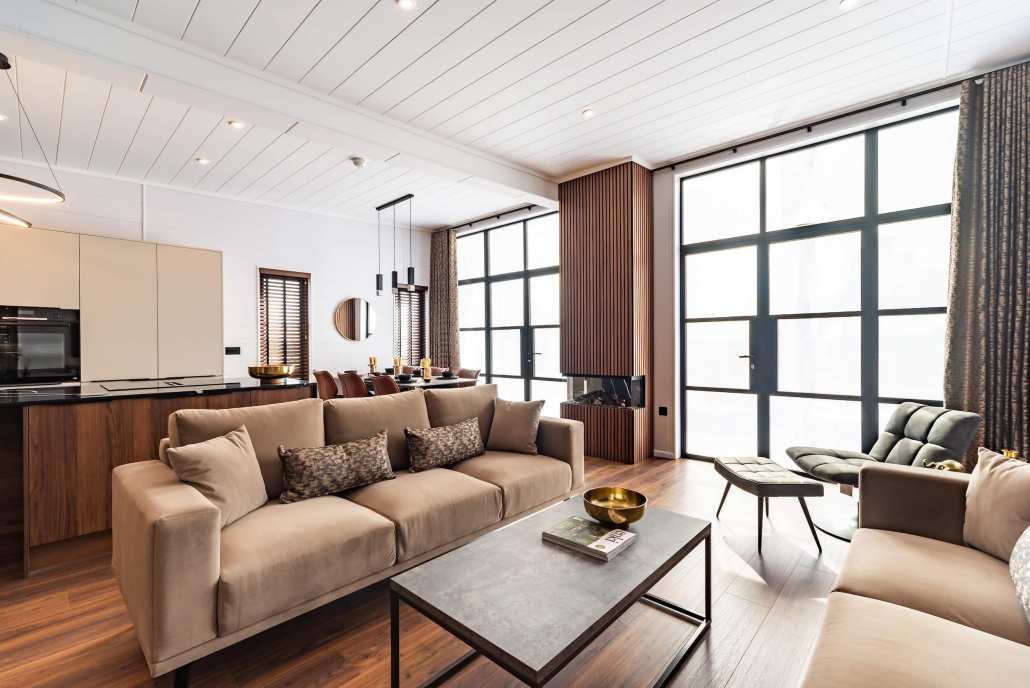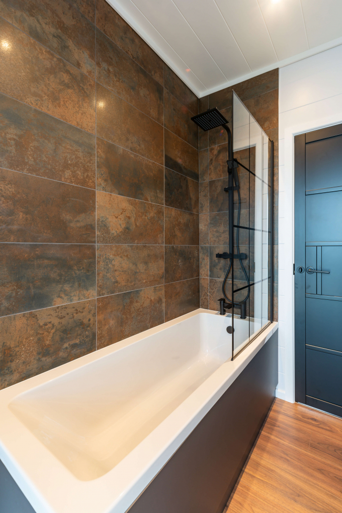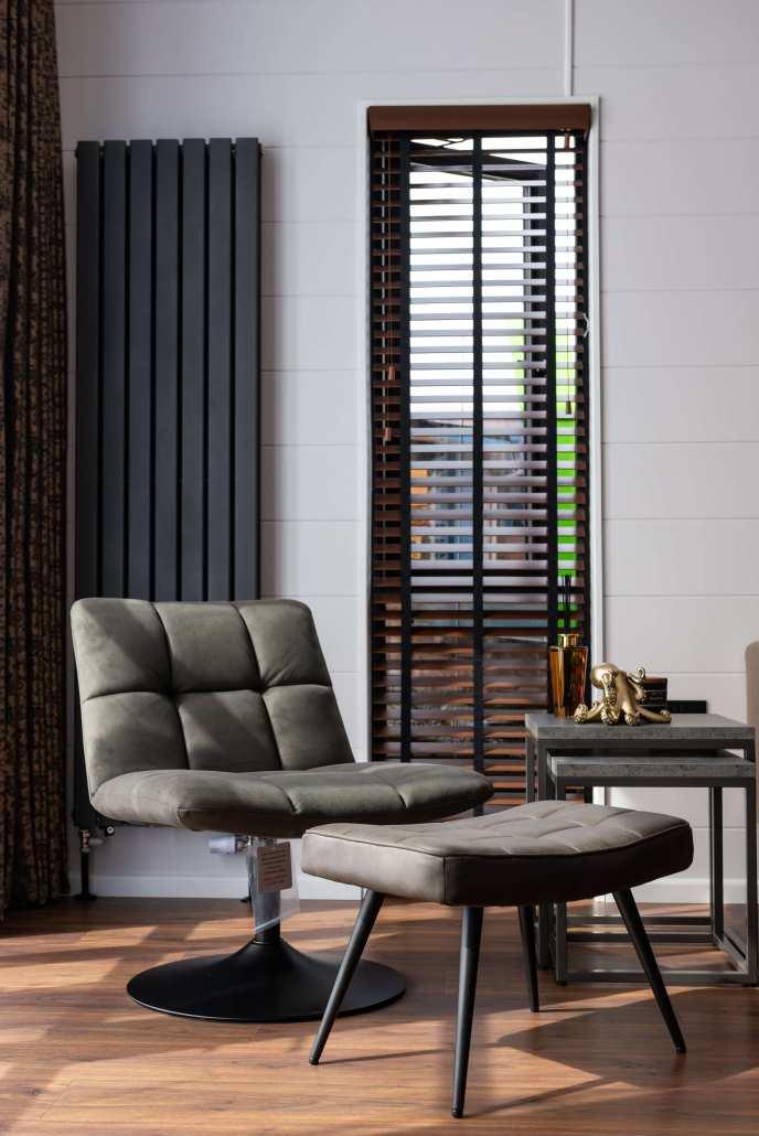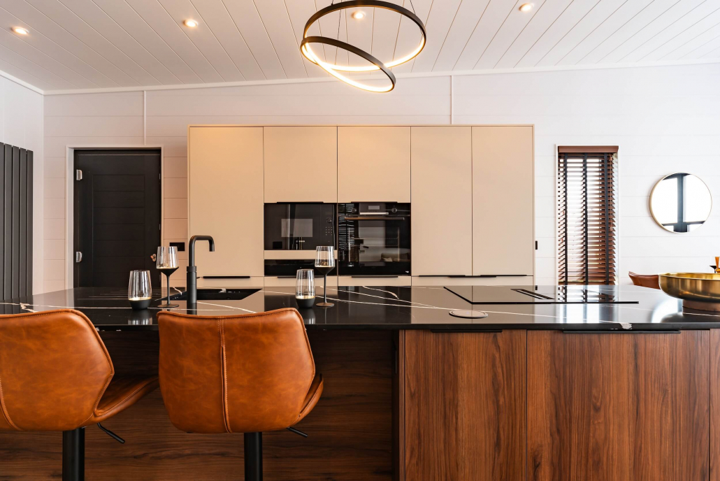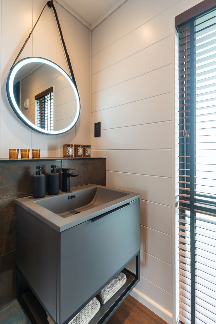 From the outside, the Tempest makes a bold impression. Finished with stylish wood-effect cladding with natural timber accents, giving the lodge a warm, high-quality look that fits beautifully into its surroundings. Subtle LED lighting accentuates its lines as dusk falls, welcoming you inside.