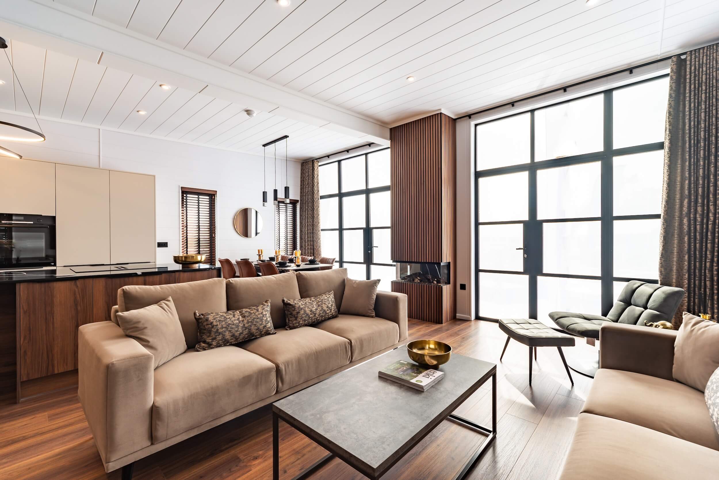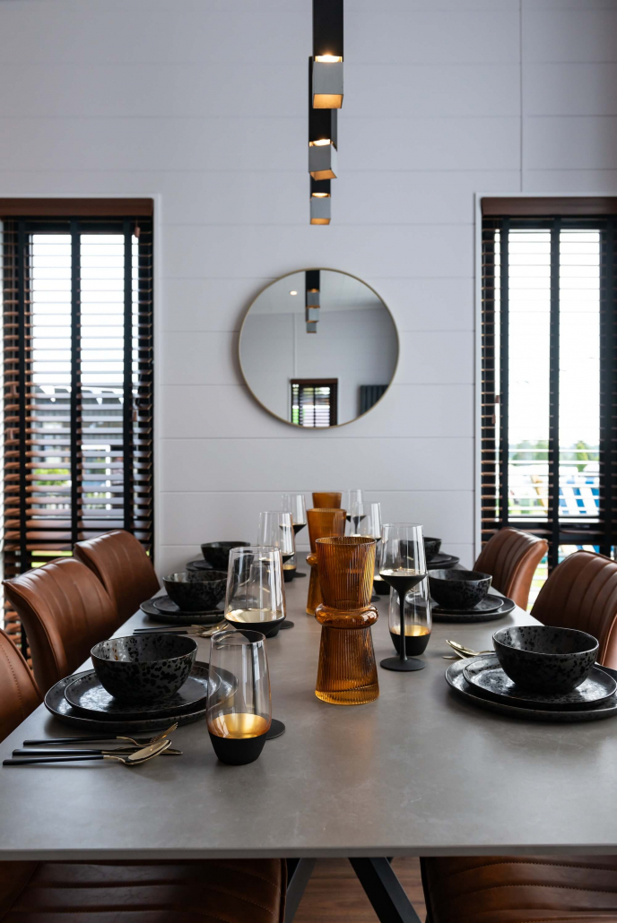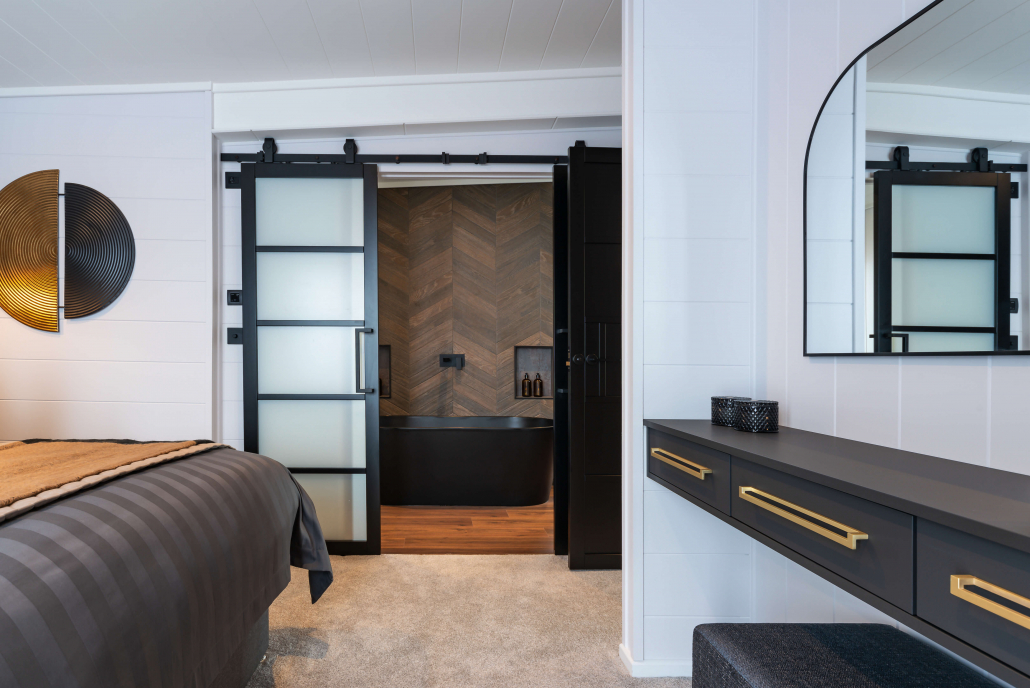 Step through and you’ll find a dramatic interior with vaulted ceilings, rich finishes, and a palette that combines neutral colours and textures. Think black quartz, mood lighting, soft drapes, and luxurious touches. The open-plan lounge, kitchen and dining area is designed for both relaxing and enjoying time with family and friends.